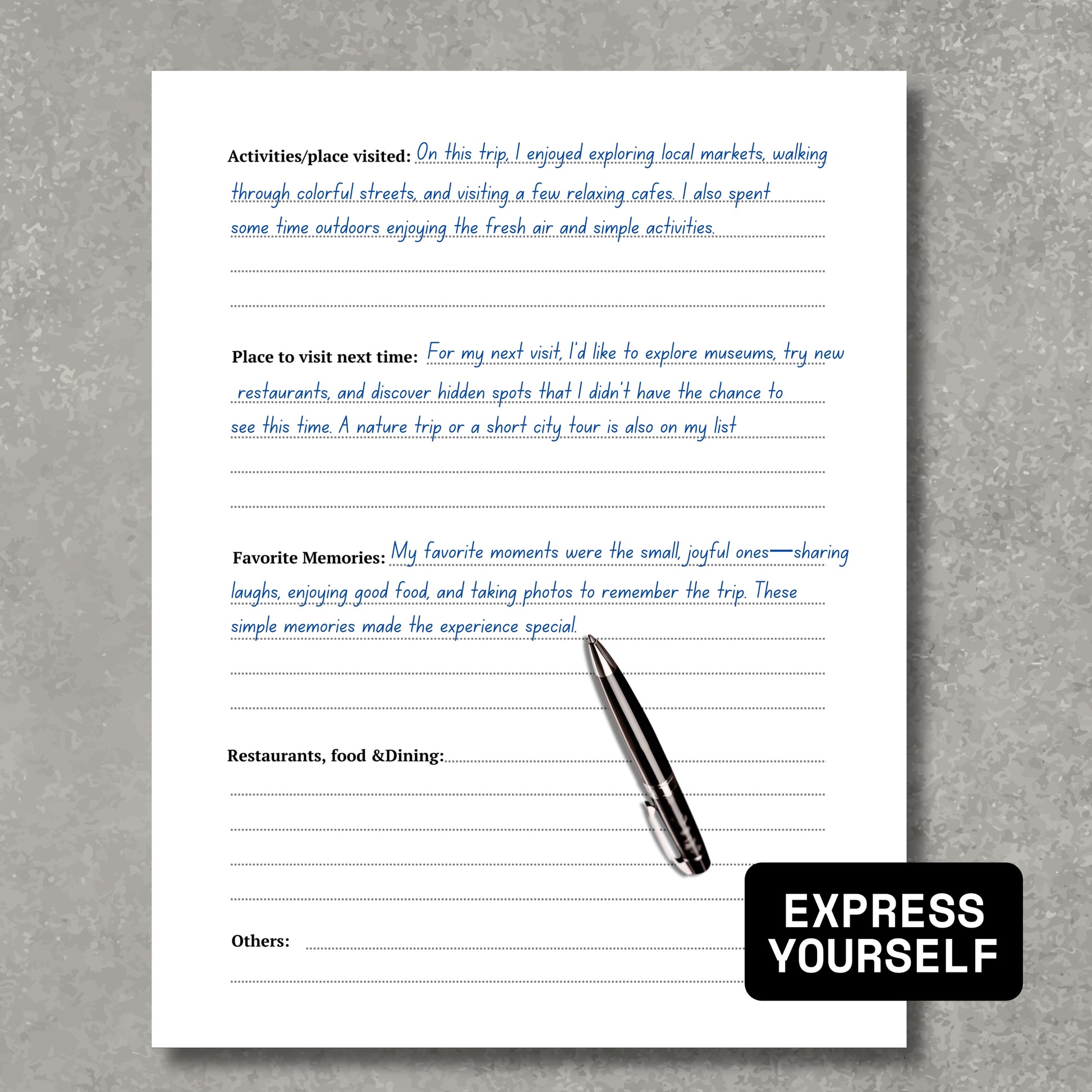 • For printing: Print pages and include them in your travel binder, scrapbook, or planner for physical record keeping.