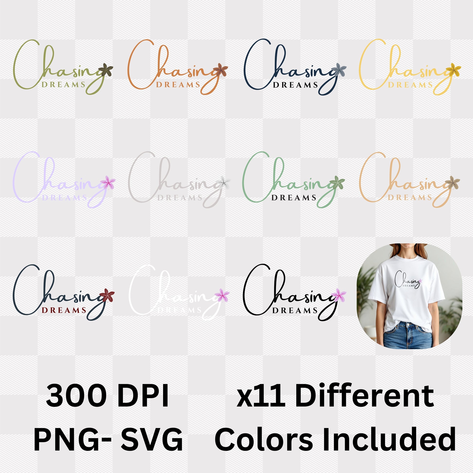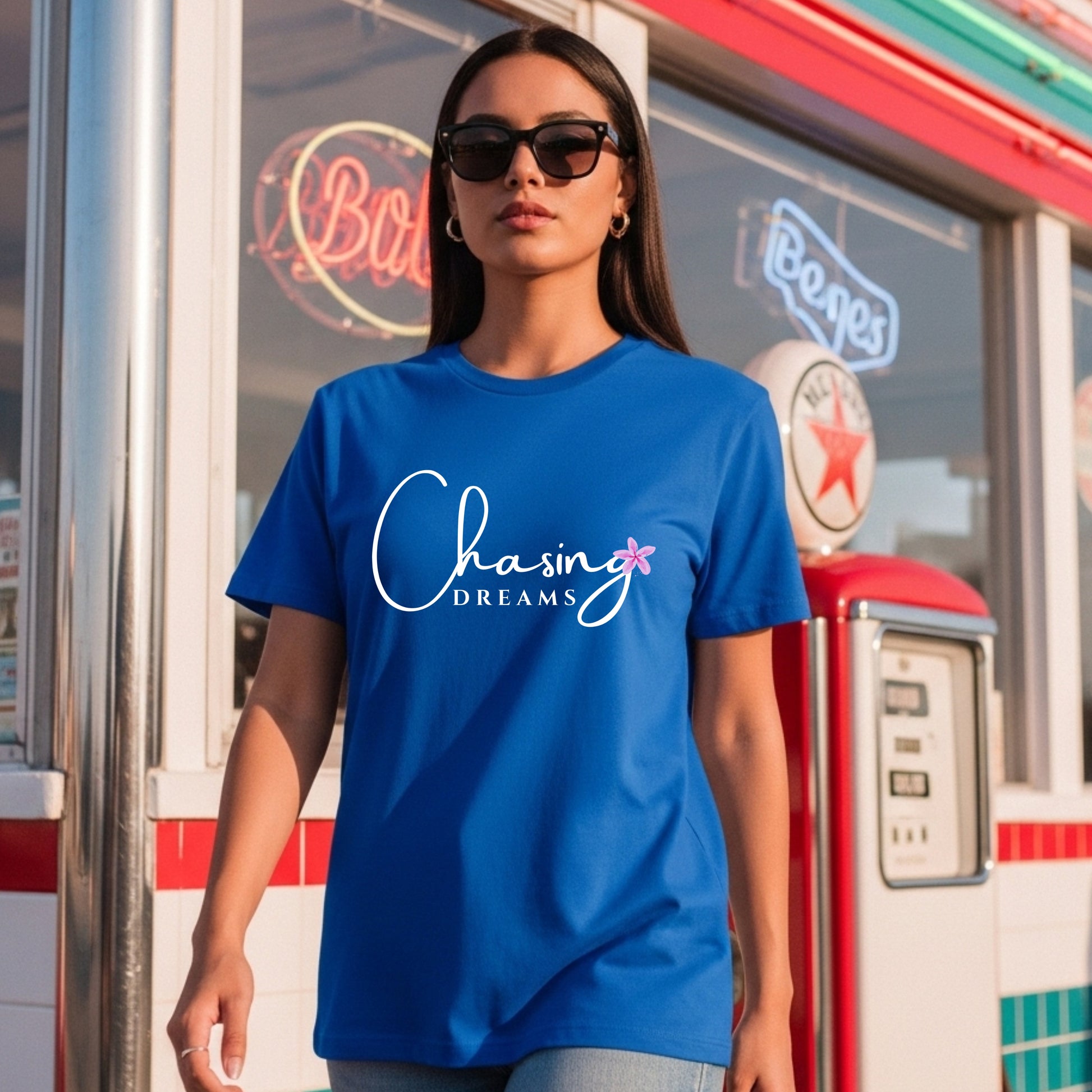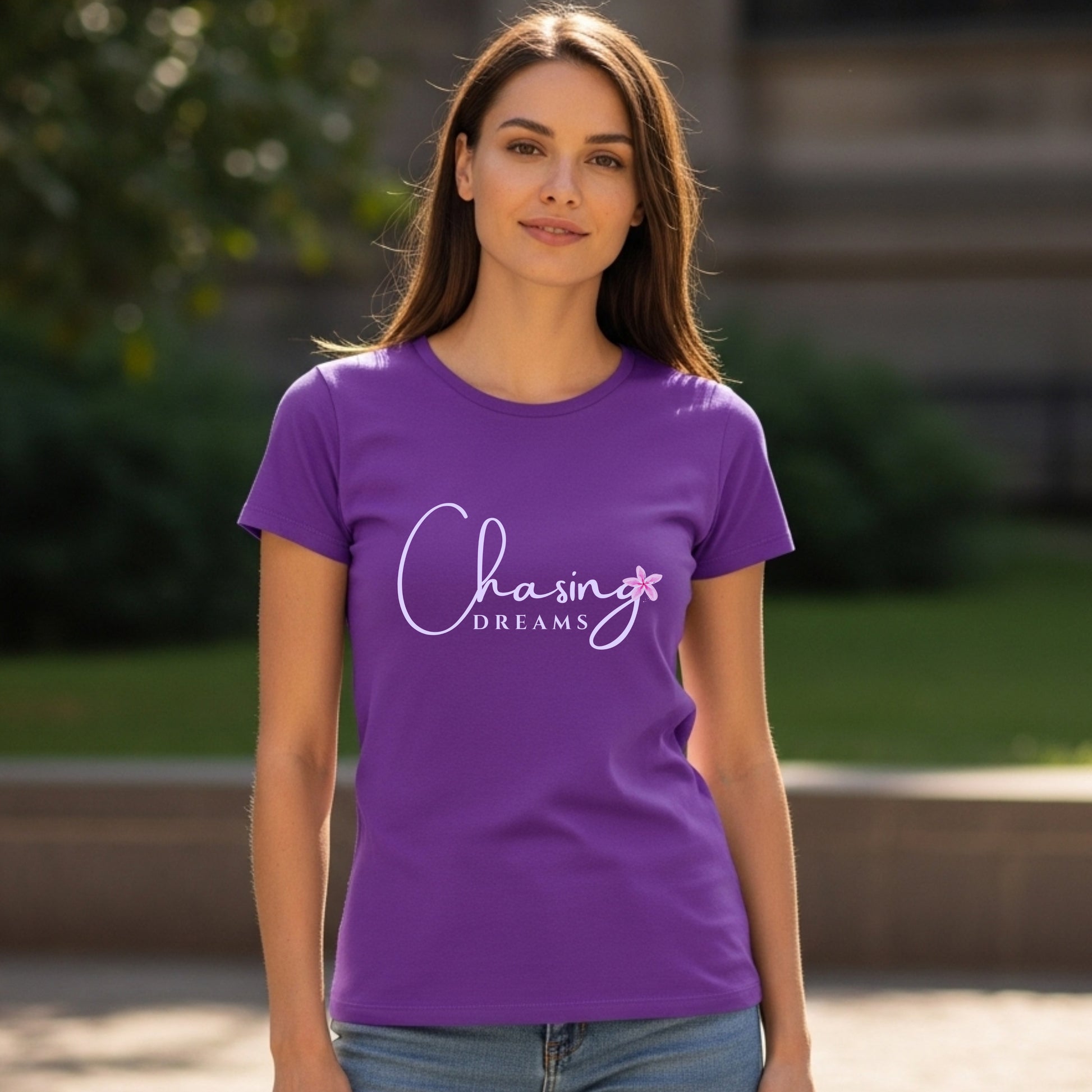 Delicate ambition, graceful pursuit. This elegant design features flowing script typography spelling "Chasing Dreams" with a soft purple flower accent, creating a refined and feminine motivational statement. It's for dream chasers who pursue their goals with grace, style, and determination.