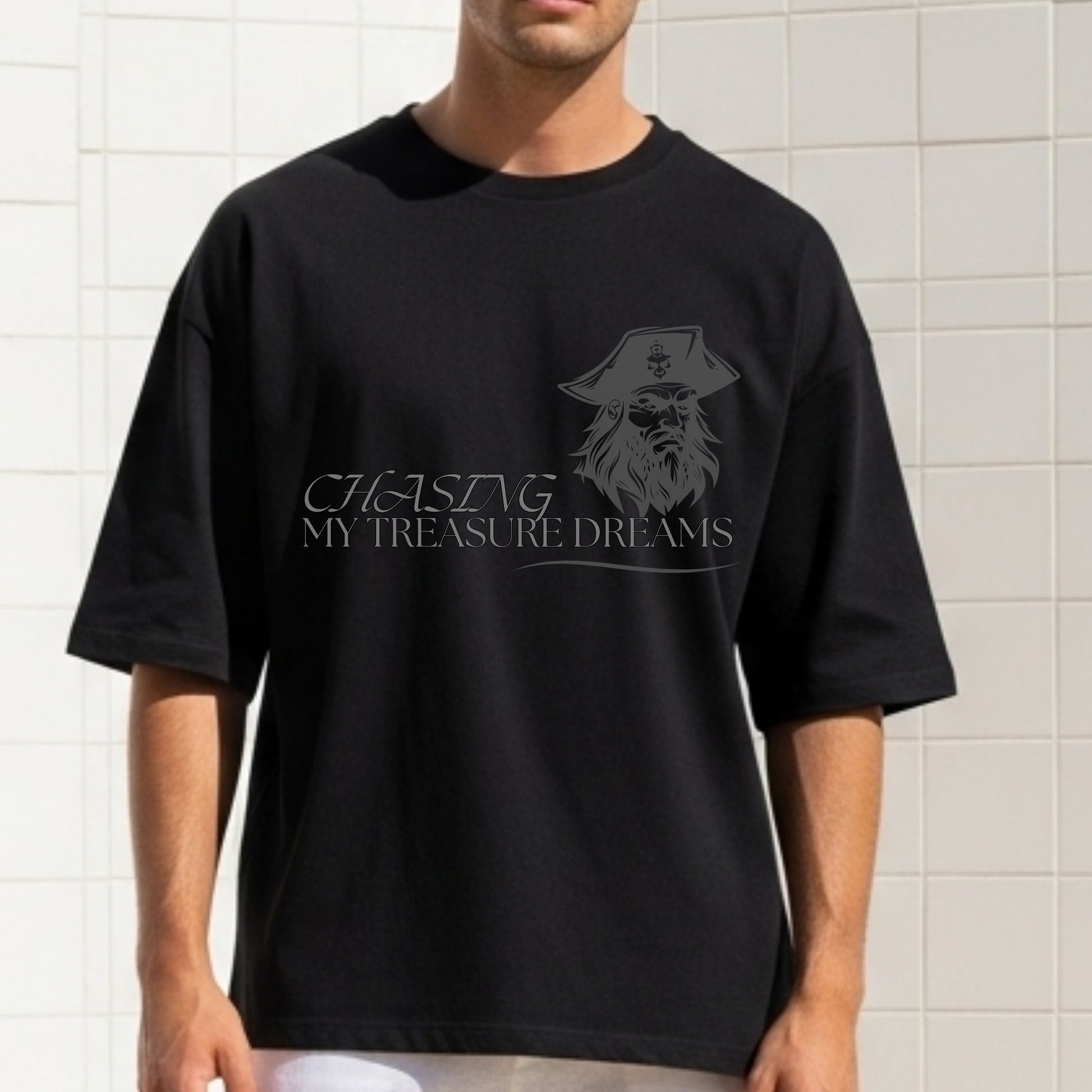 Set sail toward your fortune. This adventurous design celebrates the pursuit of your most valuable goals with bold pirate imagery and determined spirit. Featuring a detailed pirate captain graphic and elegant typography, this piece is for modern-day treasure hunters chasing their version of gold.