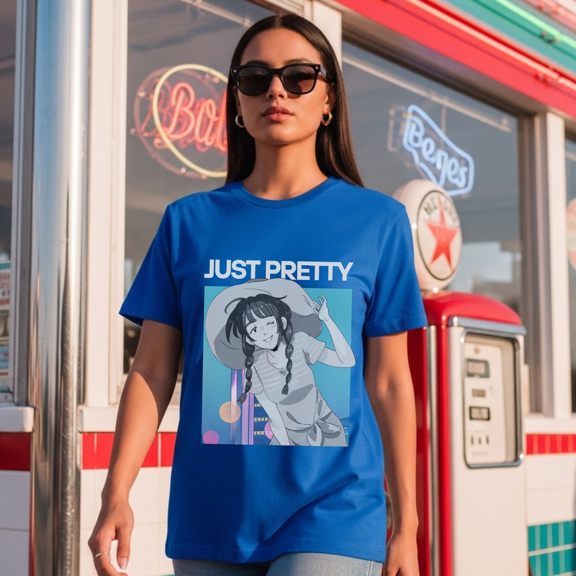 Soft vibes, pretty energy. This charming design features an adorable anime-style illustration of a girl with purple braided hair and a sweet smile against a dreamy blue and pink gradient background, topped with bold "JUST PRETTY" text. It's for anime lovers, kawaii aesthetic fans, and anyone embracing their pretty era.