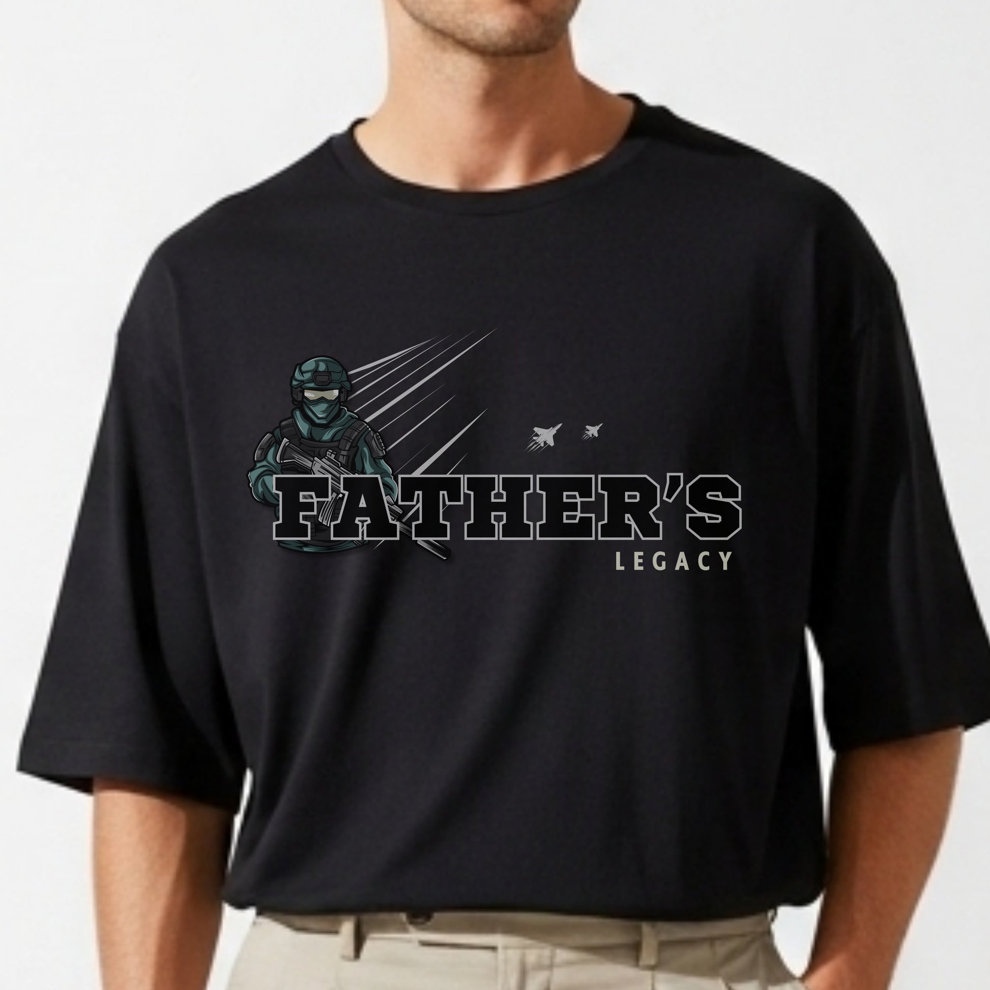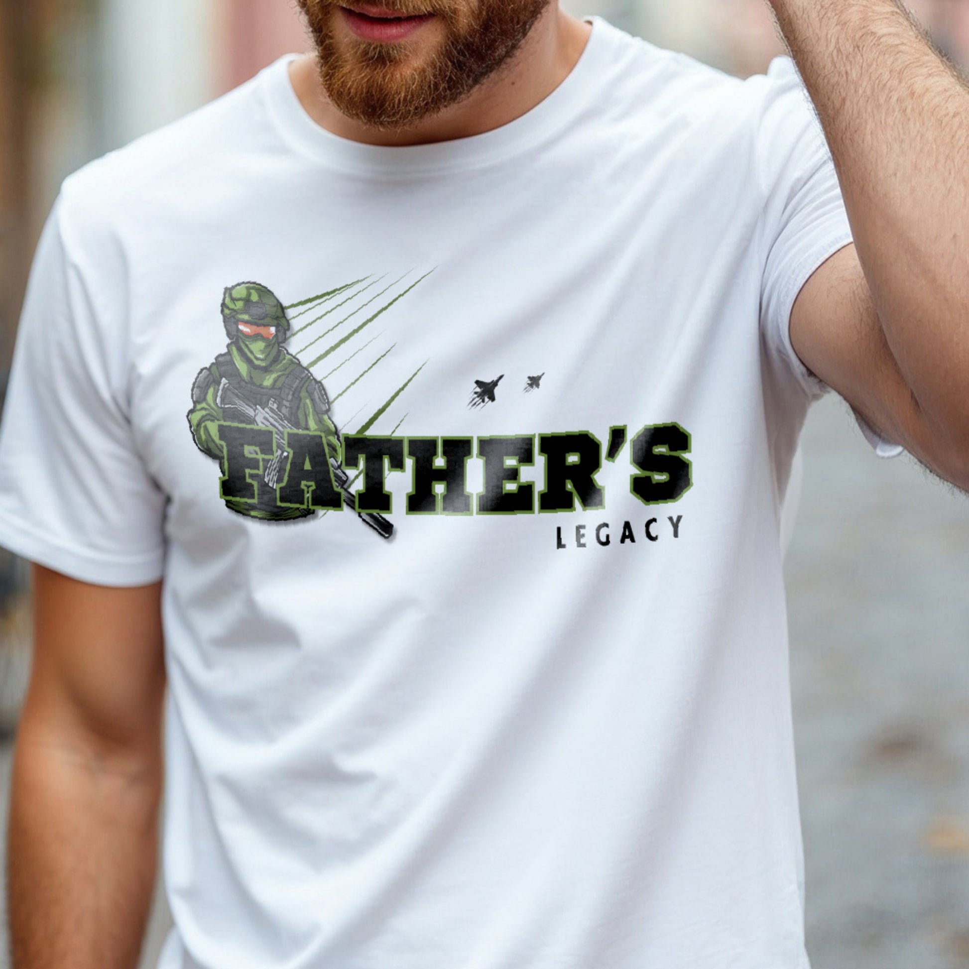 Carrying forward the mission. This powerful military-inspired design features a tactical soldier silhouette with jets overhead, honoring the legacy and sacrifice of fathers who served. It's a tribute to the courage, discipline, and values passed down through generations of warriors and protectors.