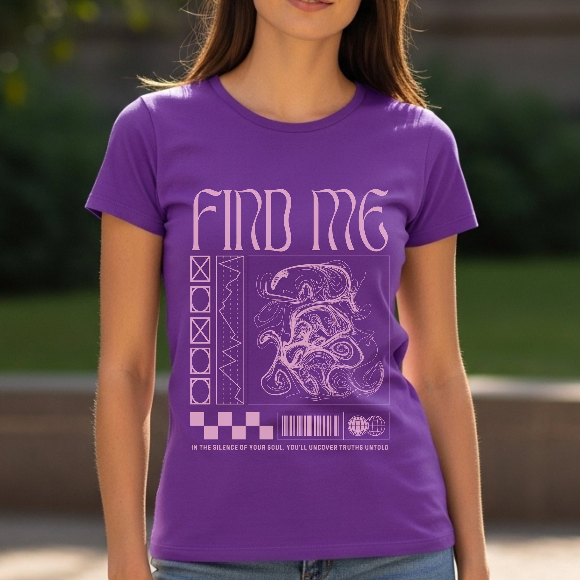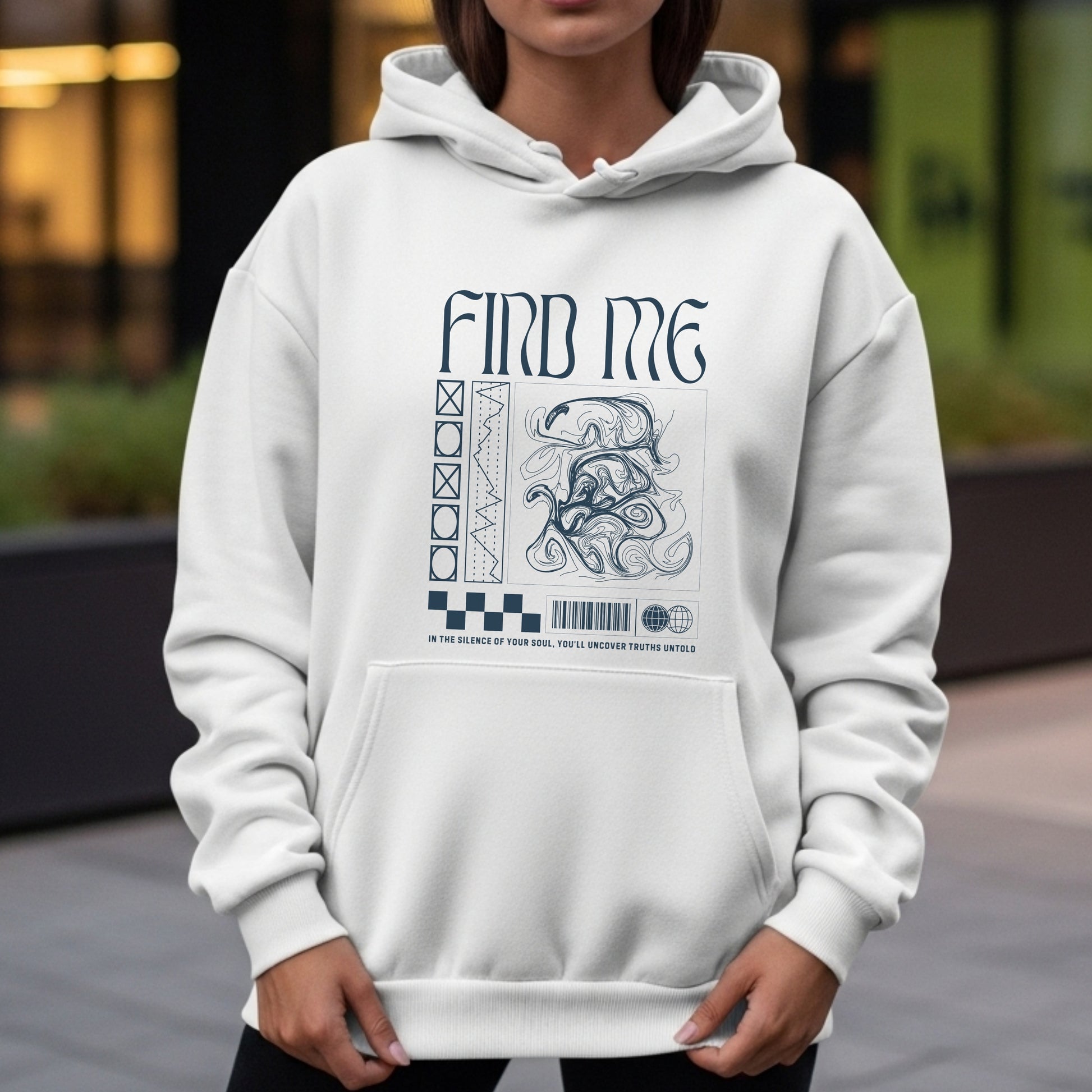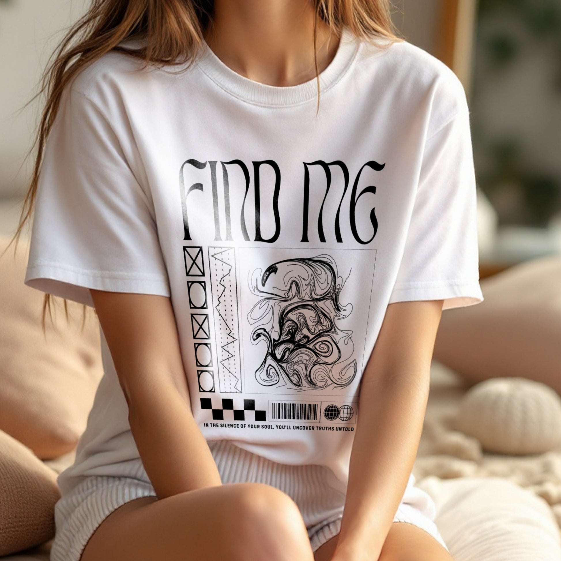 Soul searching. Truth uncovering. This intricate gothic design features ornate flowing patterns, geometric symbols, barcodes, and "FIND ME" in medieval-style typography with the profound message that in soul silence, you'll uncover untold truths. It's for spiritual seekers who understand answers come from within, not without.