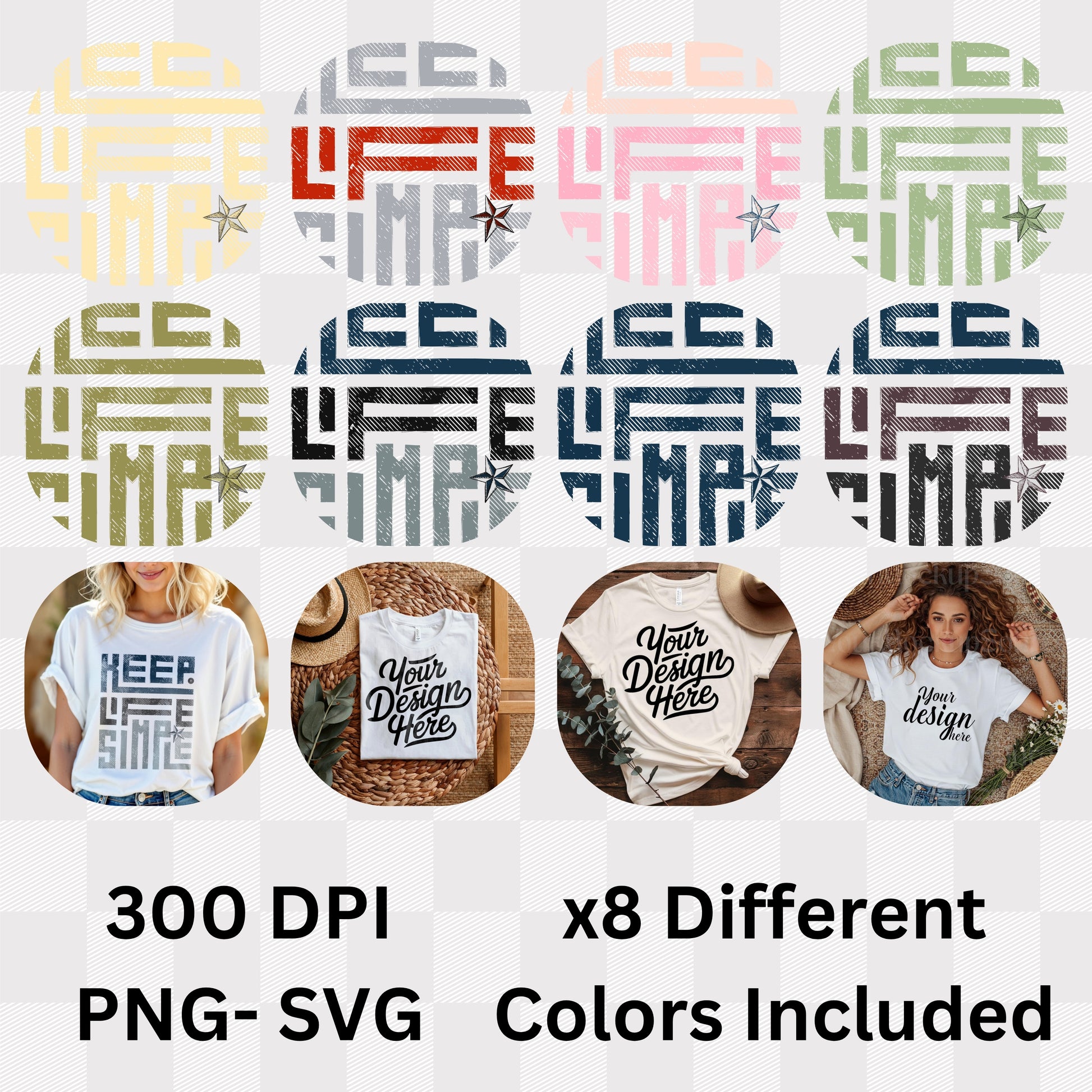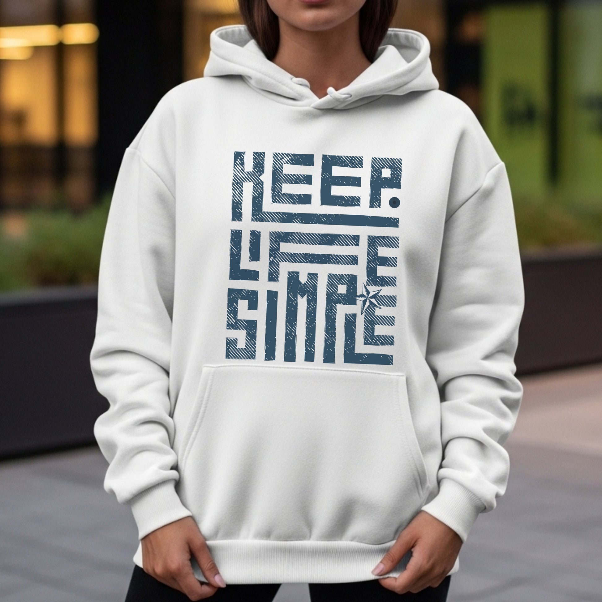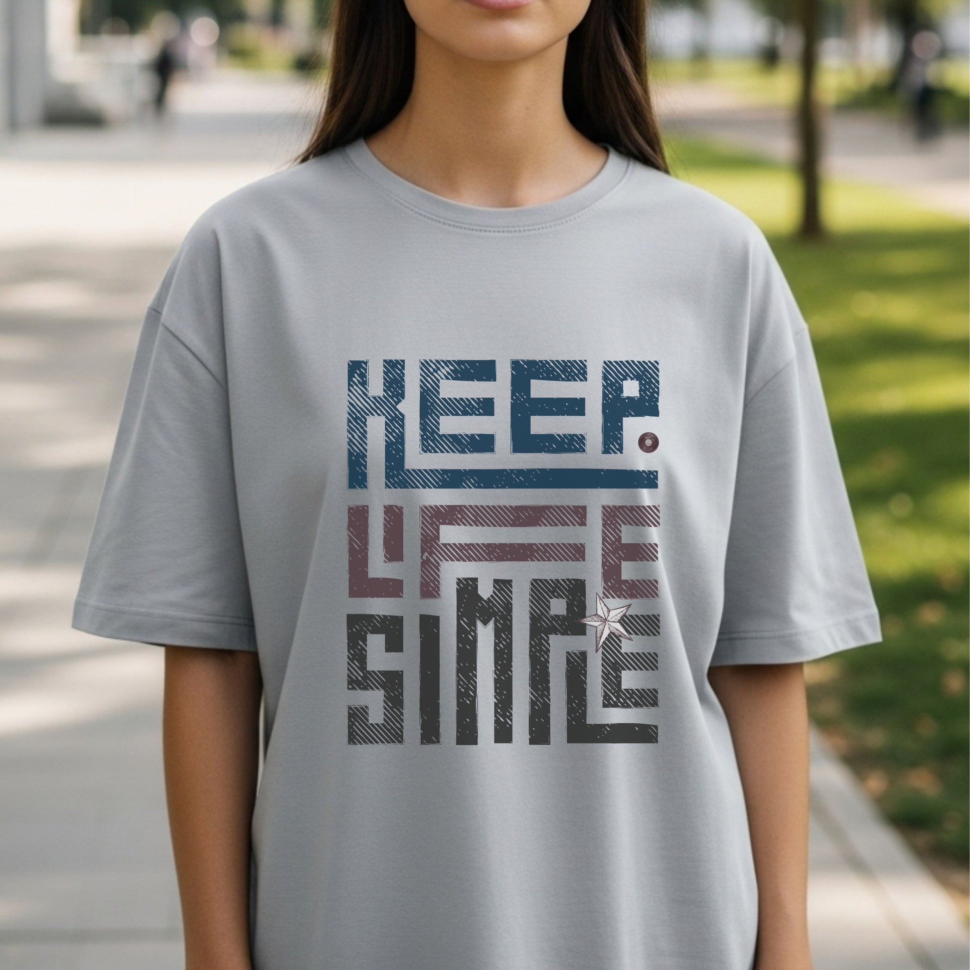 Uncomplicated existence. Simplified living. This bold distressed design features "KEEP LIFE SIMPLE" in industrial hatched typography arranged in a geometric pattern with a star accent, celebrating the power of simplification and refusing unnecessary complexity. It's for minimalists who understand that simple doesn't mean easy—it means intentional.