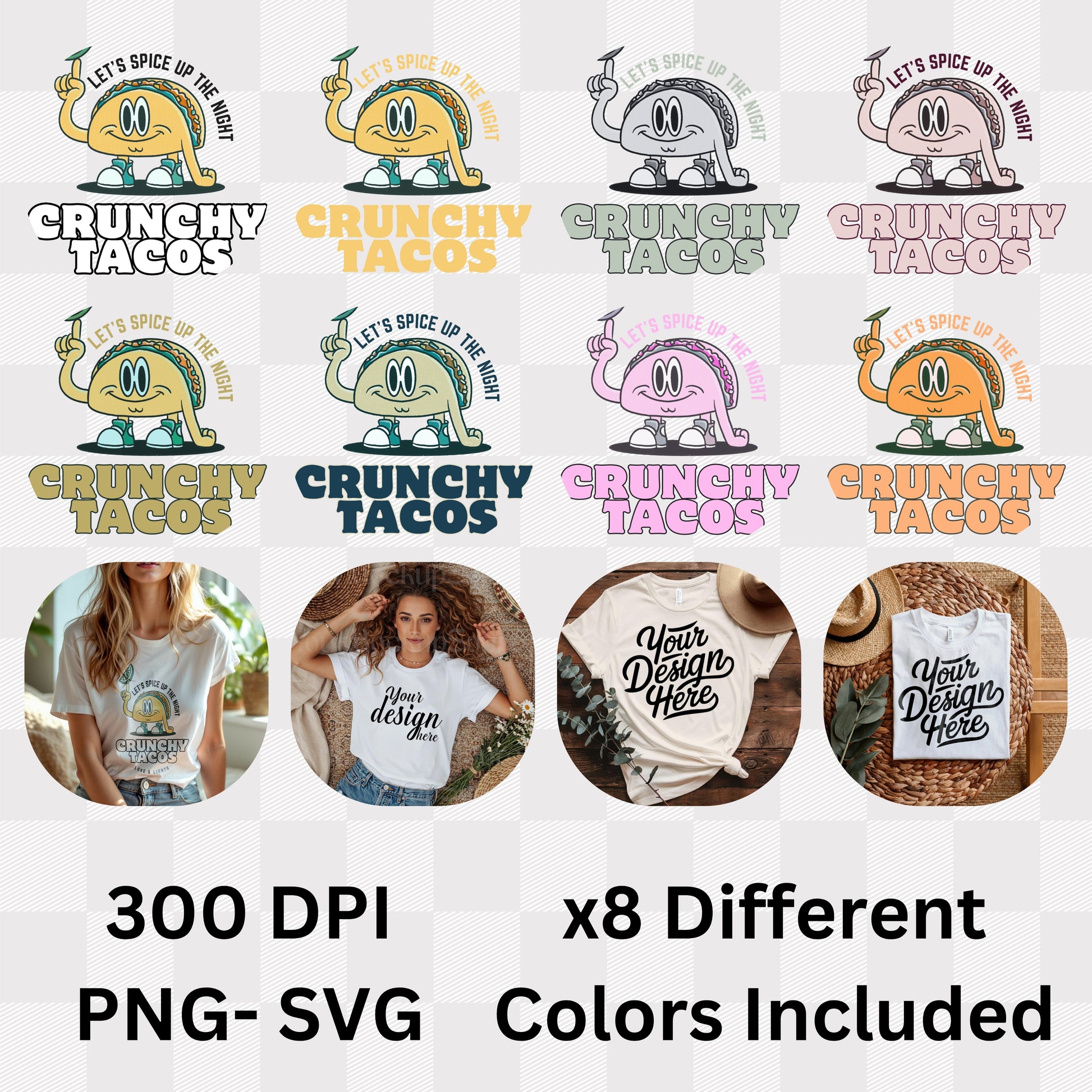 Taco night, elevated vibes. This playful design features an adorable cartoon taco character wearing sneakers with a lime wedge overhead, paired with "LET'S SPICE UP THE NIGHT" in golden yellow typography and "CRUNCHY TACOS LOVE & LIGHTS" below. It's for taco enthusiasts, food lovers with personality, and anyone who knows that tacos make everything better.