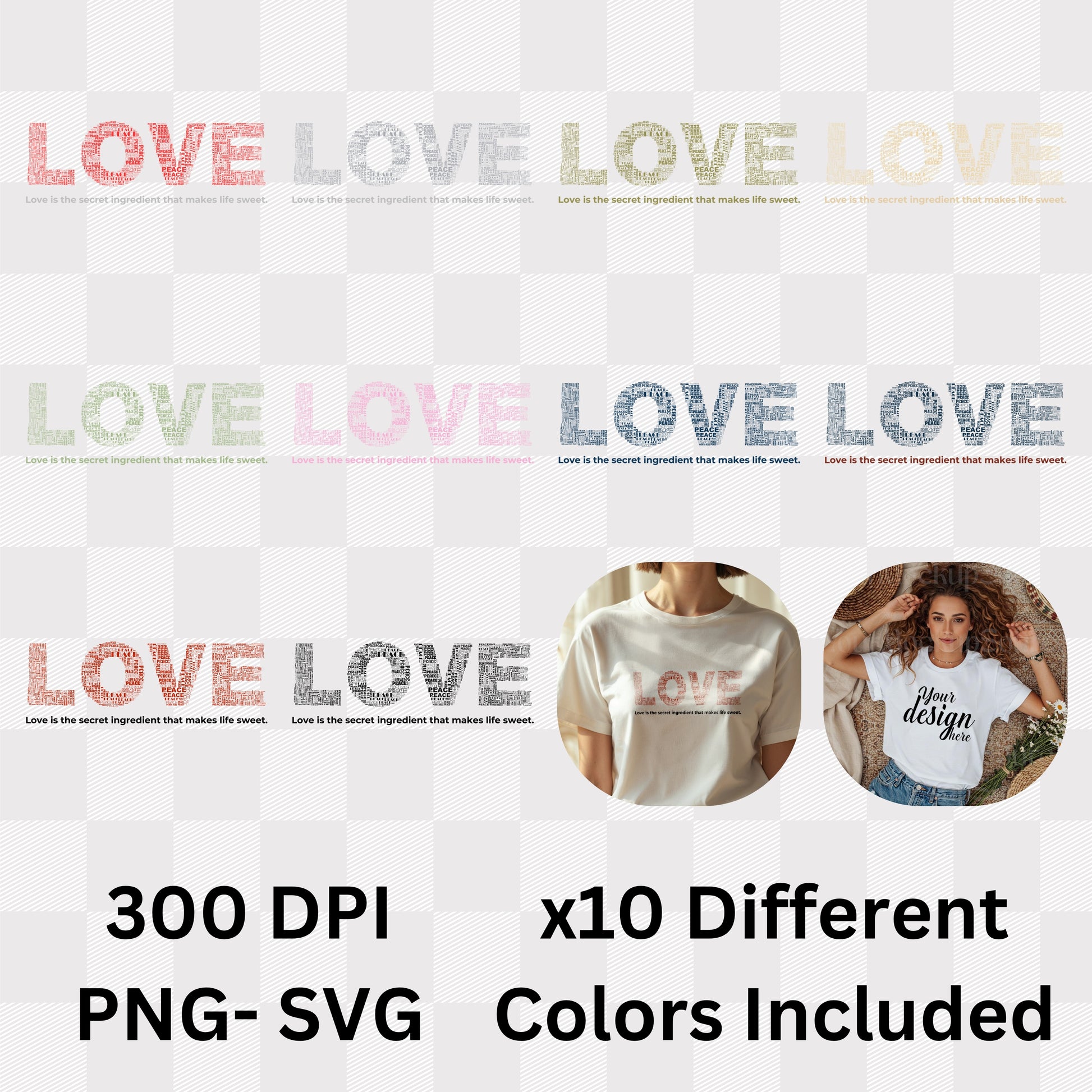 Essential element. Life sweetener. This meaningful typographic design features "LOVE" spelled out in intricate word patterns including peace, kindness, and compassion, with the profound reminder that "Love is the secret ingredient that makes life sweet." It's for those who understand that love—in all its forms—is the foundation of a meaningful existence.