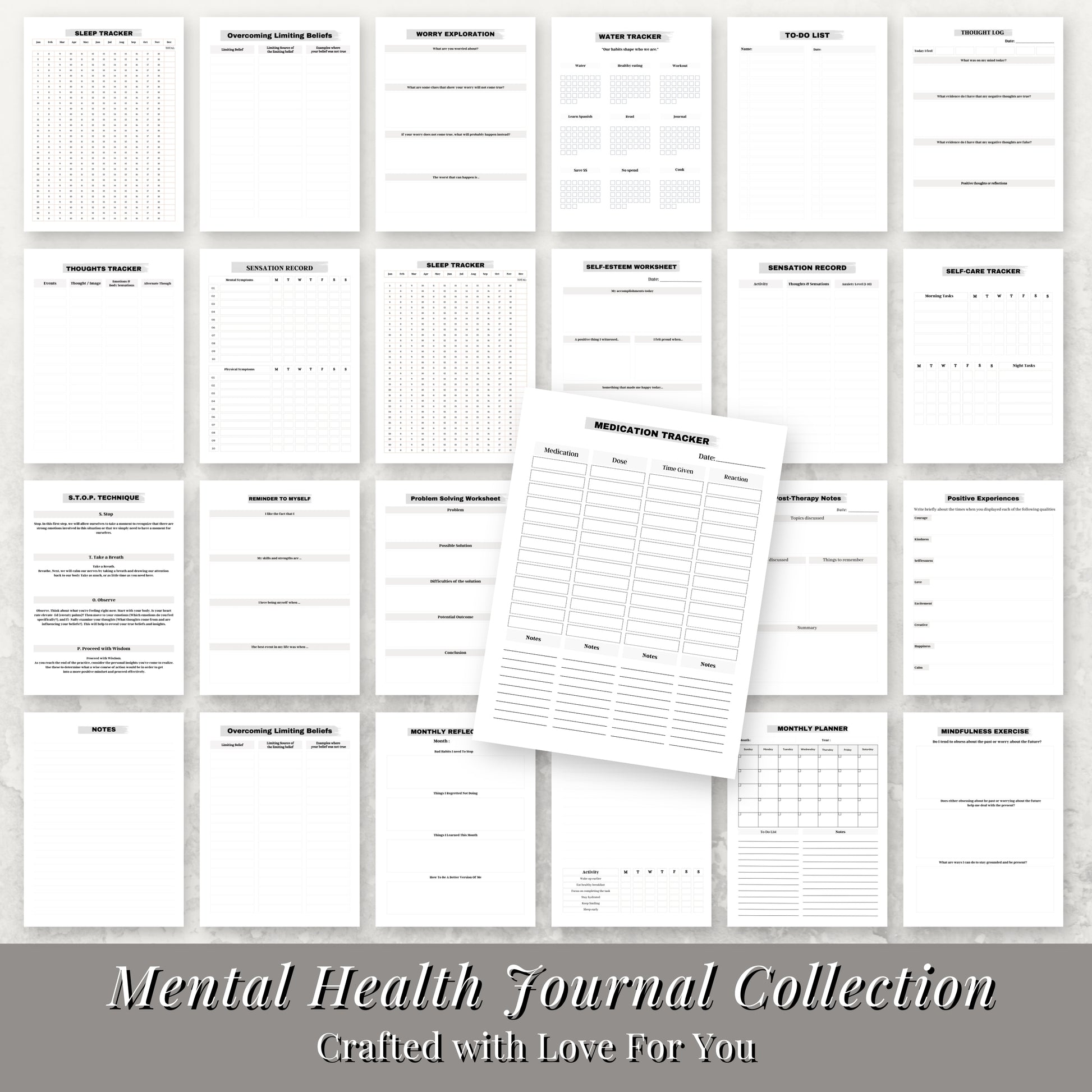 • Holistic Mental Wellness Tools: From proven coping techniques like the 4-7-8 Breathing and S.T.O.P. method to in-depth journals and trackers.