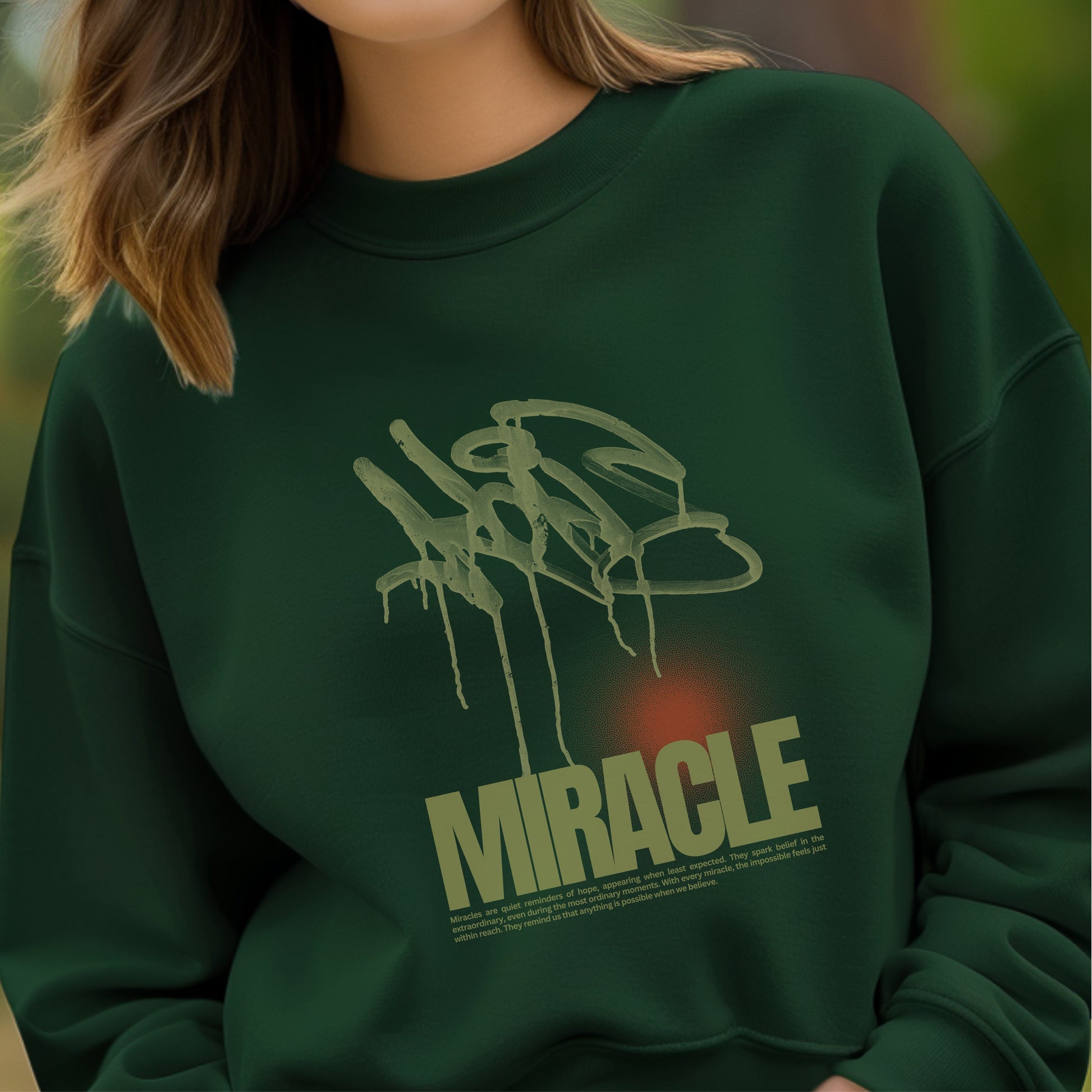 Quiet hope. Extraordinary belief. This powerful urban design features graffiti-style elements, a glowing red heart effect, and bold "MIRACLE" typography with text explaining that miracles are quiet reminders of hope appearing when least expected, making the impossible feel possible. It's for believers who trust in miracles even when logic says otherwise.