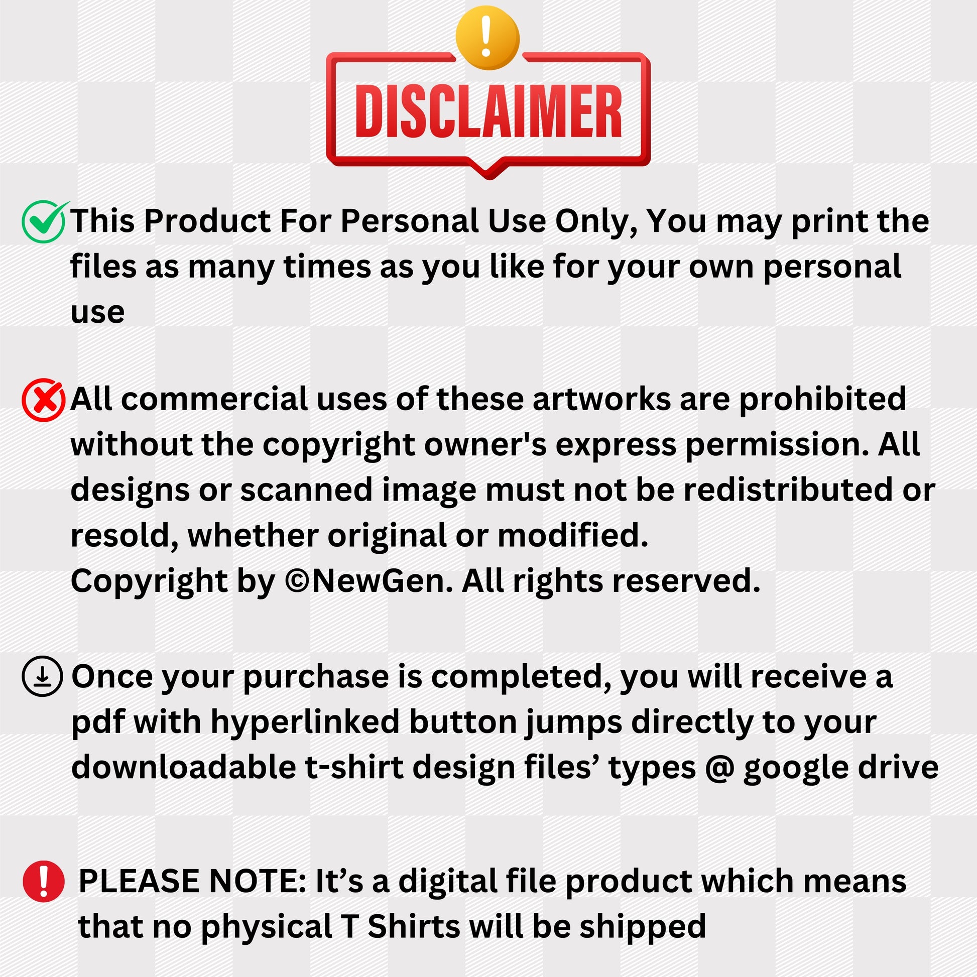 - Not for commercial resale. You may not sell physical products with this design.