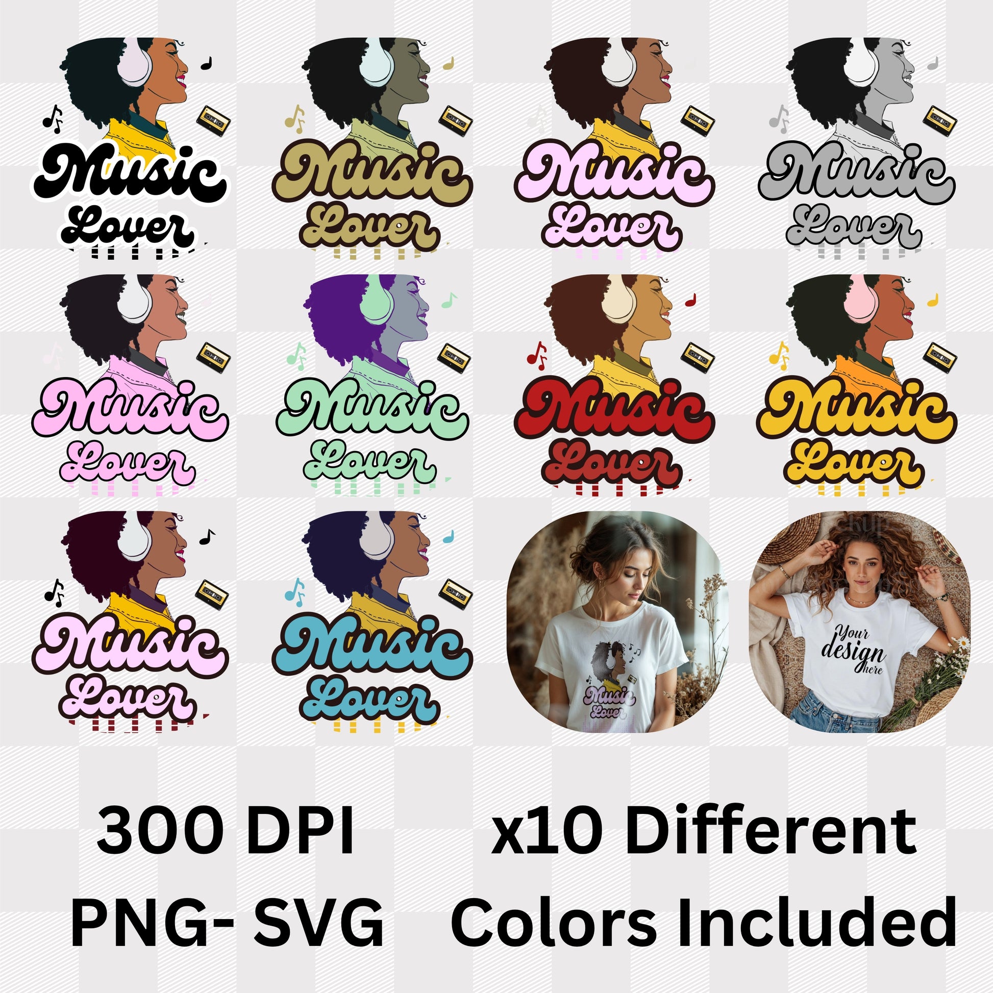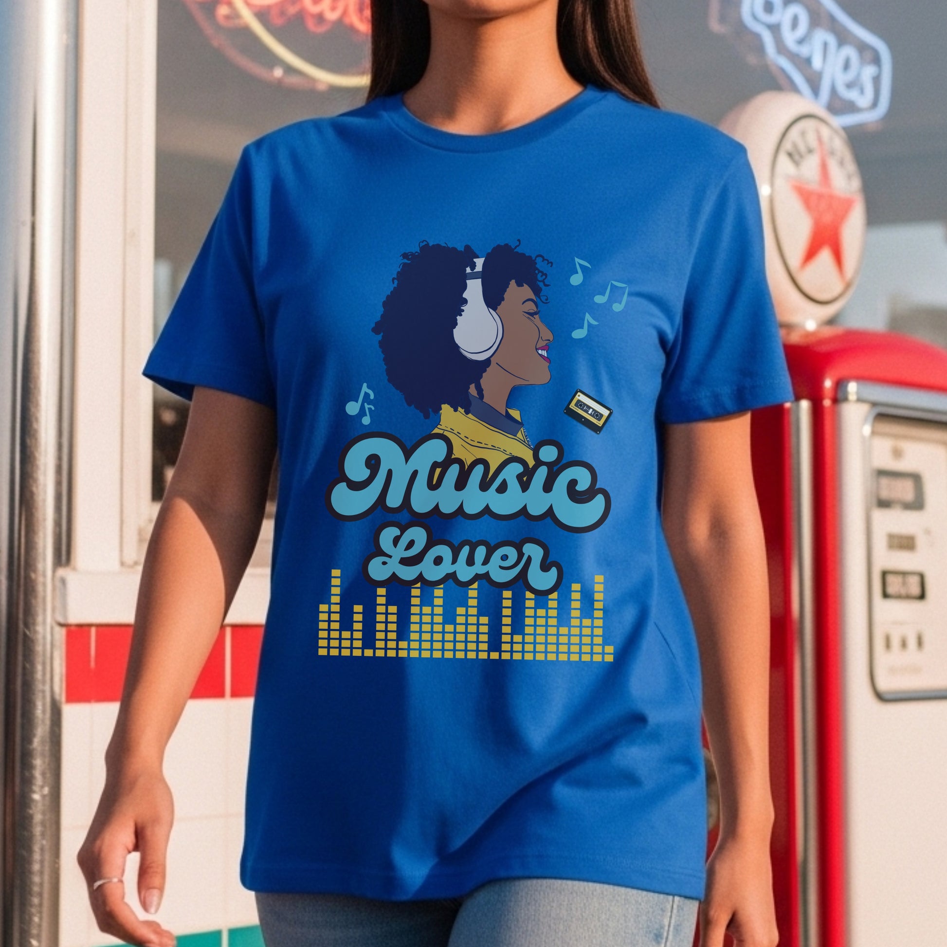 Soundtrack living, melody breathing. This vibrant illustration features a stylish woman with natural curly hair wearing white headphones and a yellow jacket, lost in music with floating musical notes, paired with pink script "Music Lover" typography and an audio equalizer graphic below. It's for those who live life with a personal soundtrack.