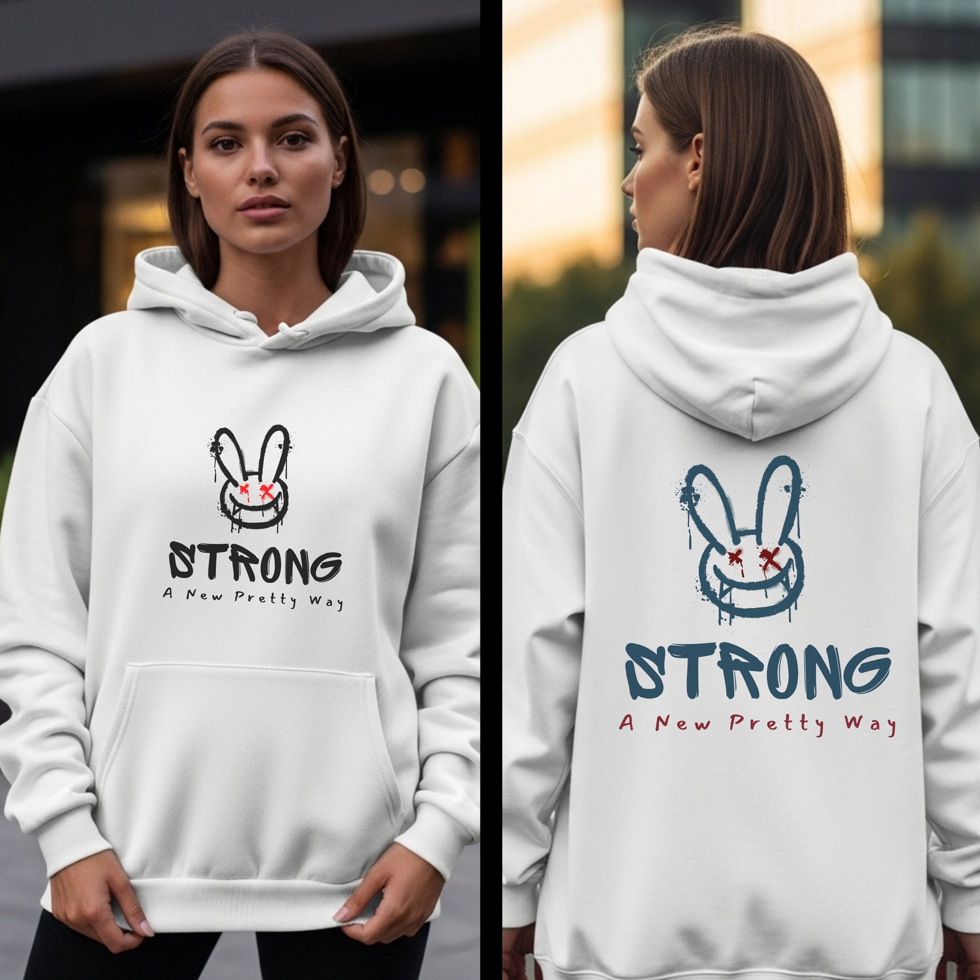 Redefining beauty, reclaiming strength. This bold design features an edgy graffiti-style bunny with red X eyes and a mischievous grin above hand-drawn typography reading "STRONG A New Pretty Way." It's for those who reject traditional beauty standards and know that strength is the new definition of pretty.