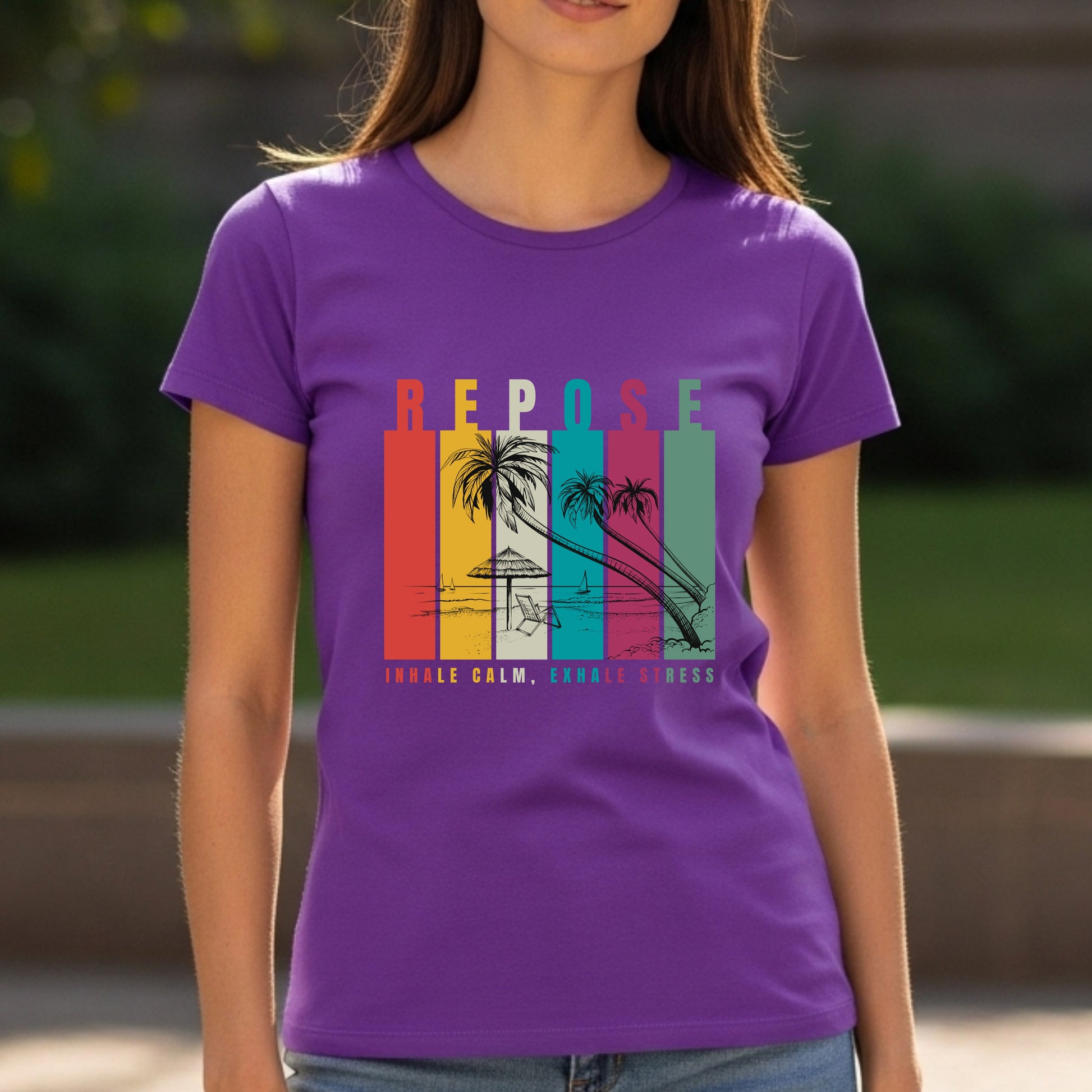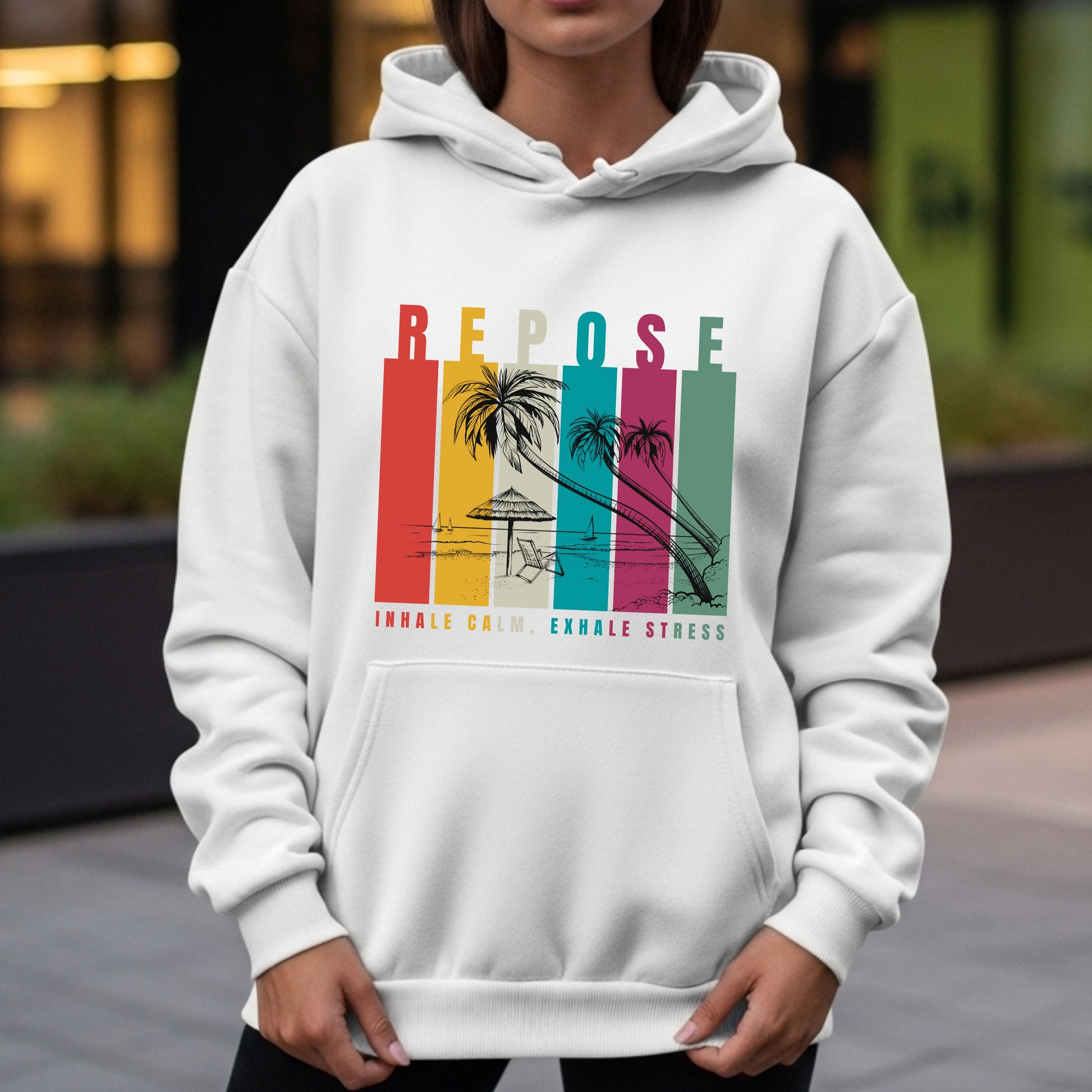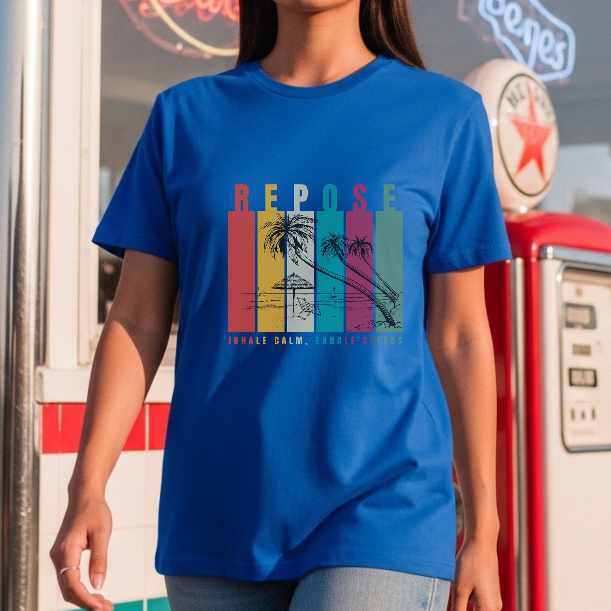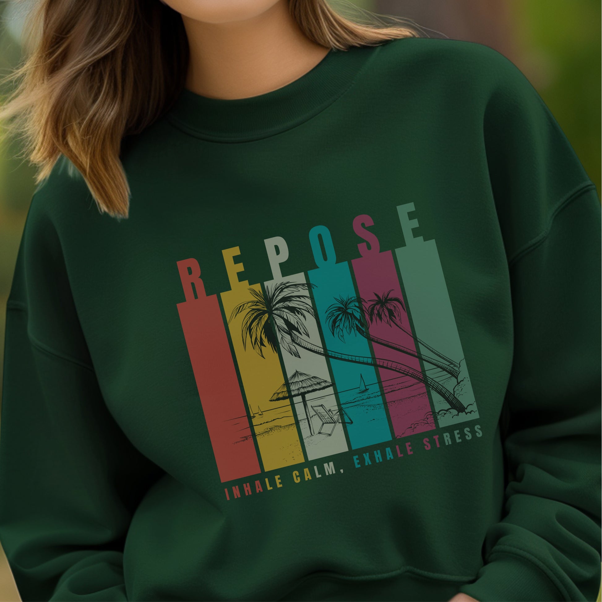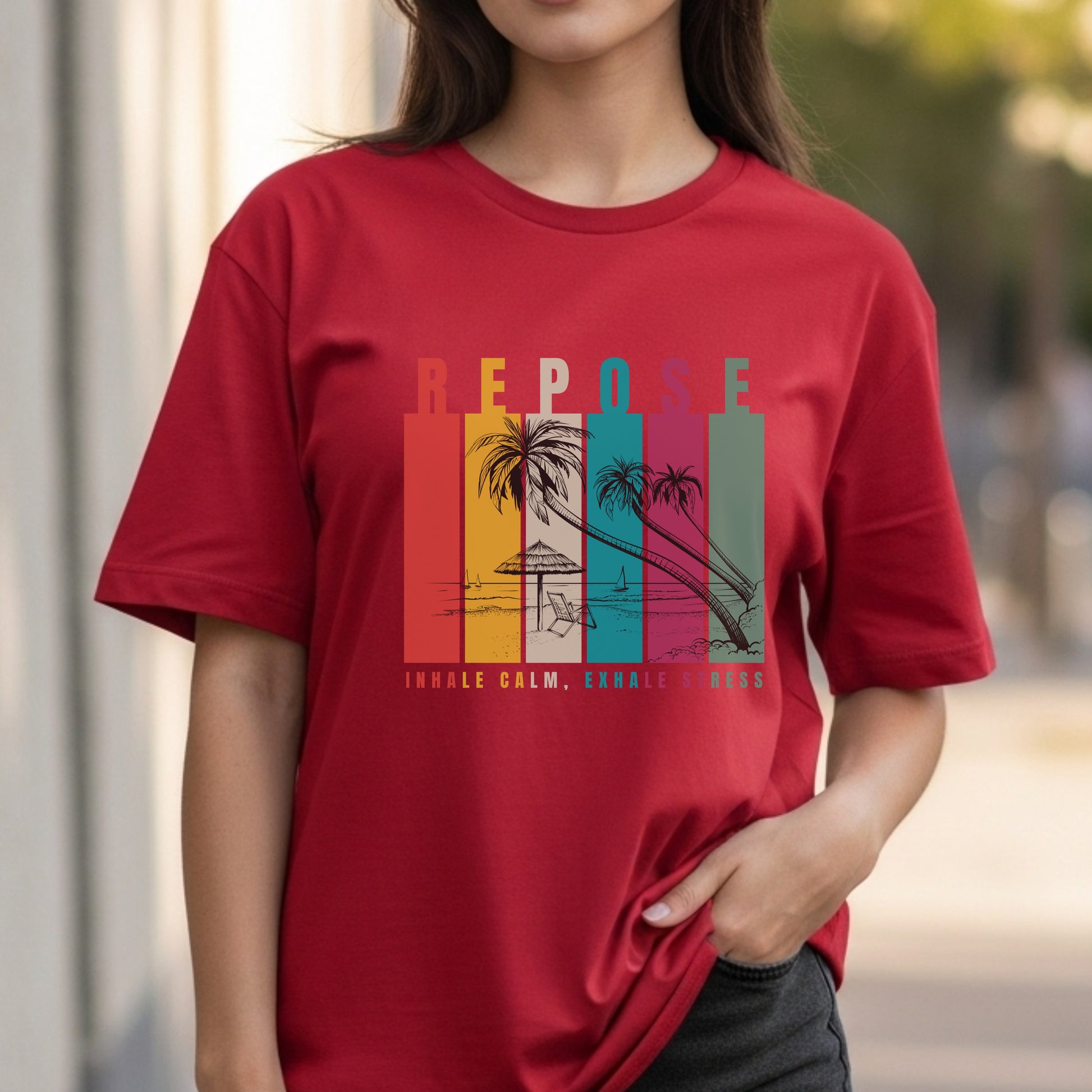 Breathe in peace. Release tension. This serene retro-style design features a tranquil beach scene with palm trees and lounge chairs displayed across colorful vertical panels spelling "REPOSE," with the calming reminder to "INHALE CALM, EXHALE STRESS." It's for mindfulness practitioners who understand that rest isn't lazy—it's essential.