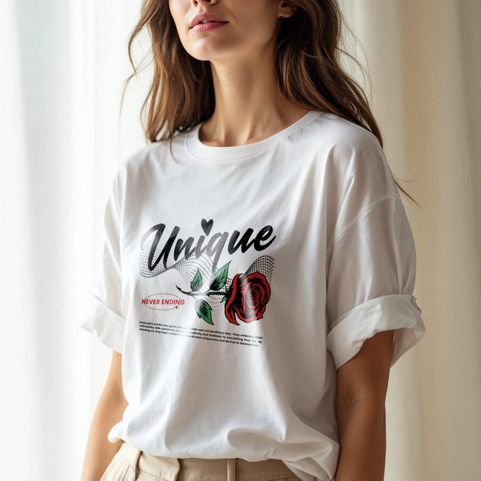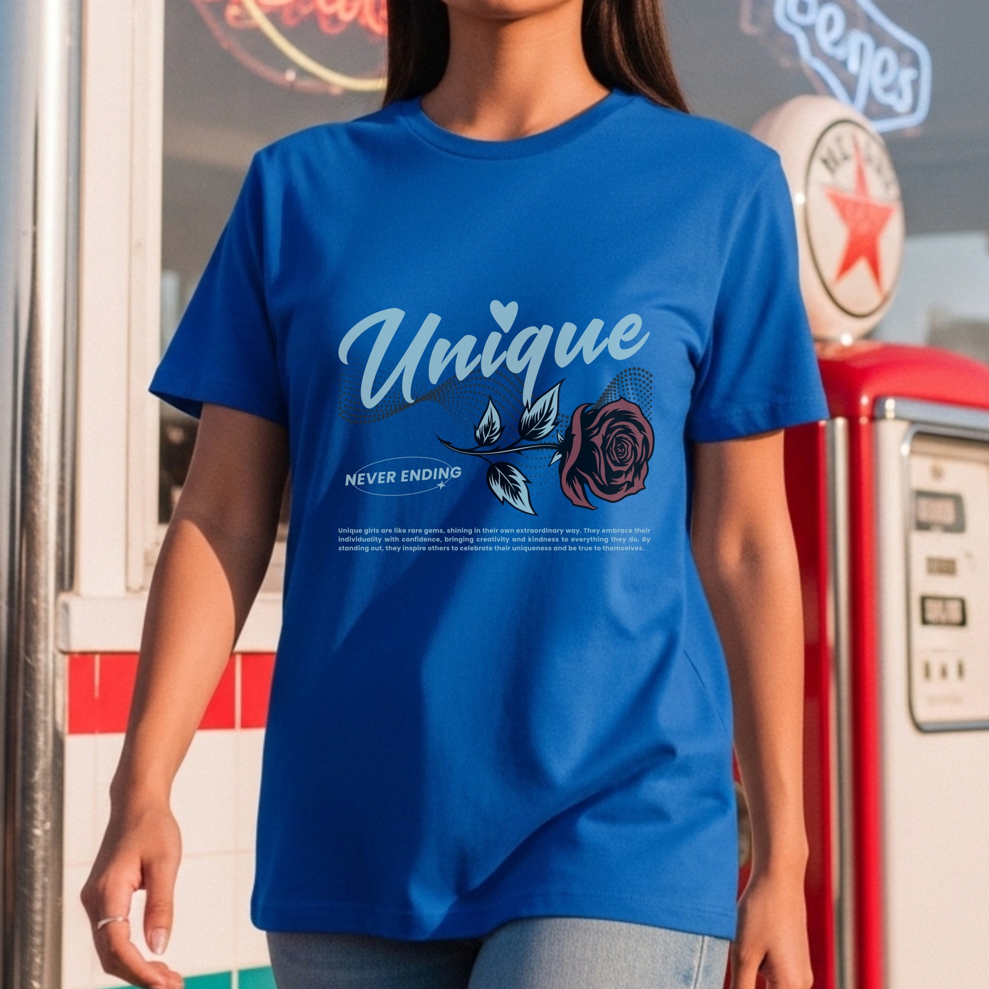Rare gem energy. Endless originality. This artistic design features a striking red rose illustration with "Unique" in flowing script and "NEVER ENDING" in bold text, celebrating girls who shine in their own extraordinary way by embracing individuality with confidence and bringing creativity and kindness to everything they do. It's for those who understand uniqueness isn't a phase—it's eternal.