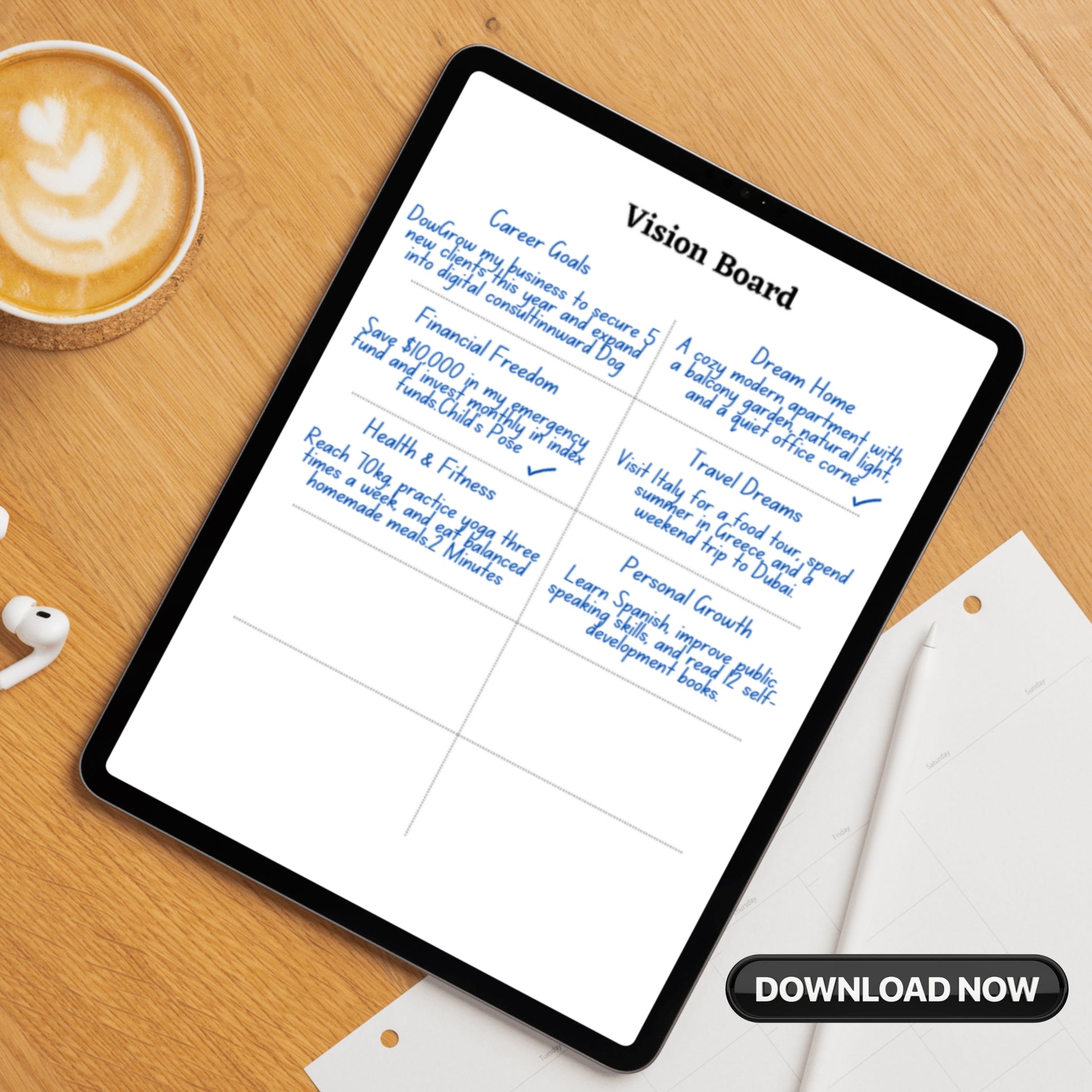 • For printing: Print pages and use them on a corkboard, wall, or in a binder to create a physical vision board.