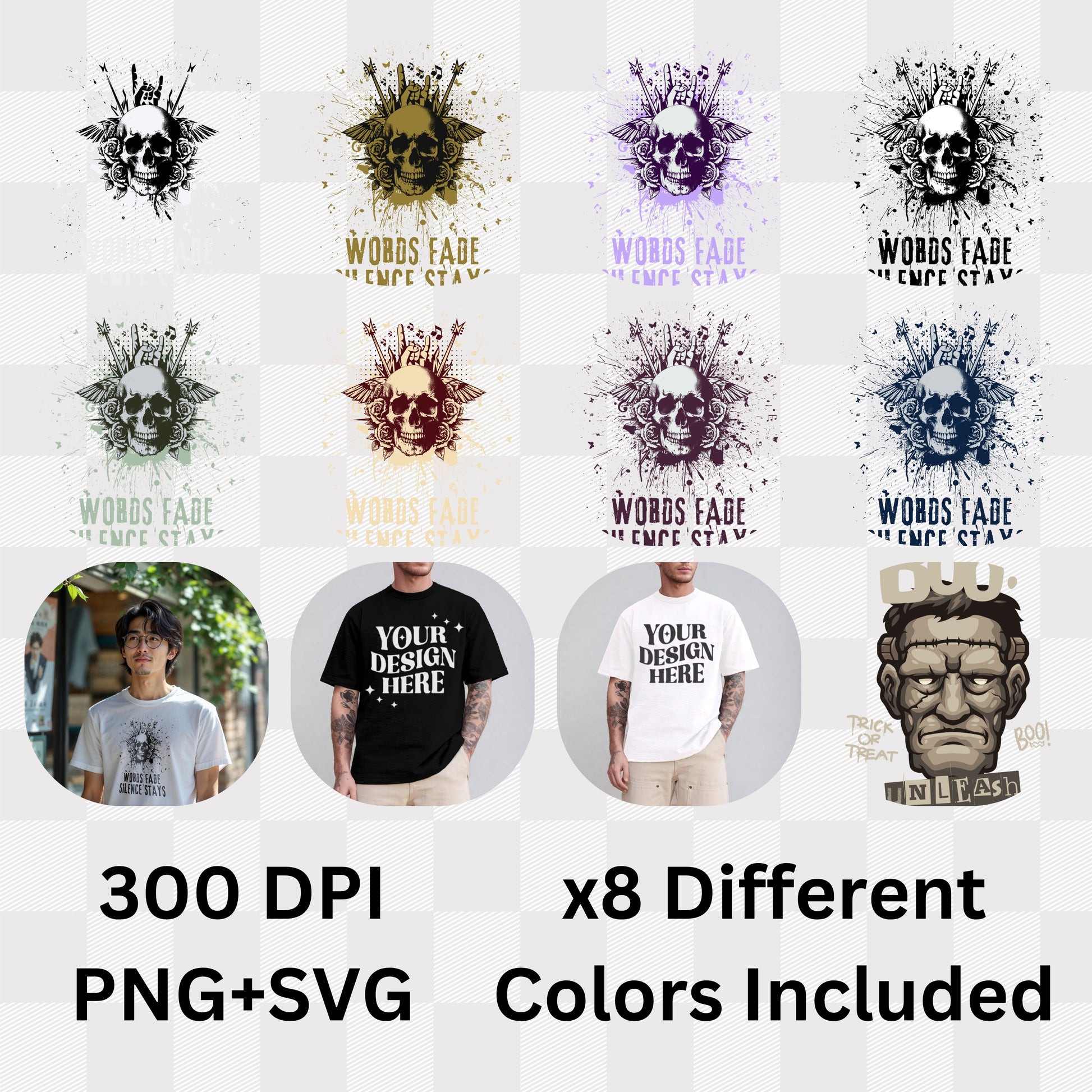 Actions speak, silence endures. This powerful design features an explosive skull illustration surrounded by roses with dramatic splatter effects, celebrating the profound truth that while words disappear into the air, meaningful silence leaves lasting impressions. It's for those who understand that sometimes saying nothing says everything.