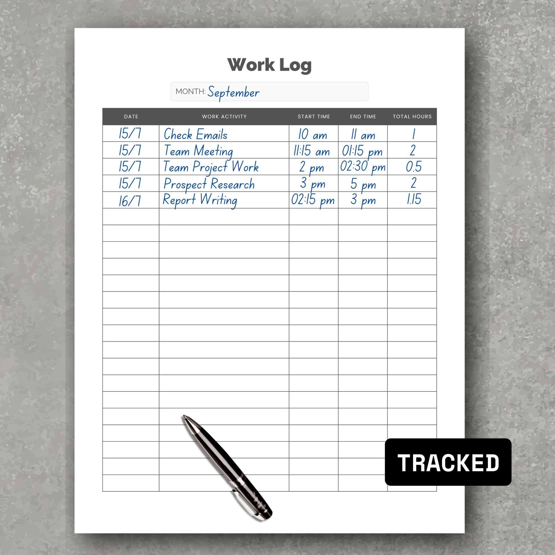 • For printing: Print pages and include them in a planner, binder, or folder for easy physical tracking of work time.